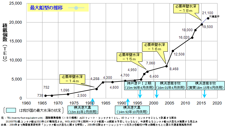 スケールメリットによる輸送コスト低減のため、コンテナ船が大型化している。